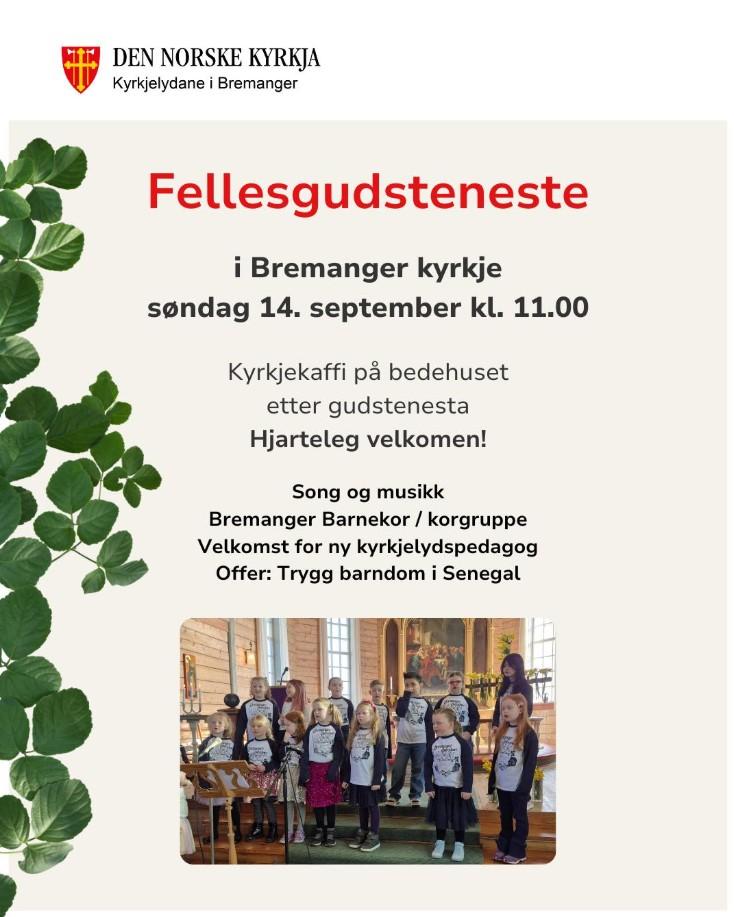 Velkommen til fellesgudsteneste i Bremanger kyrkje søndag 14. september kl. 11.00 🌿