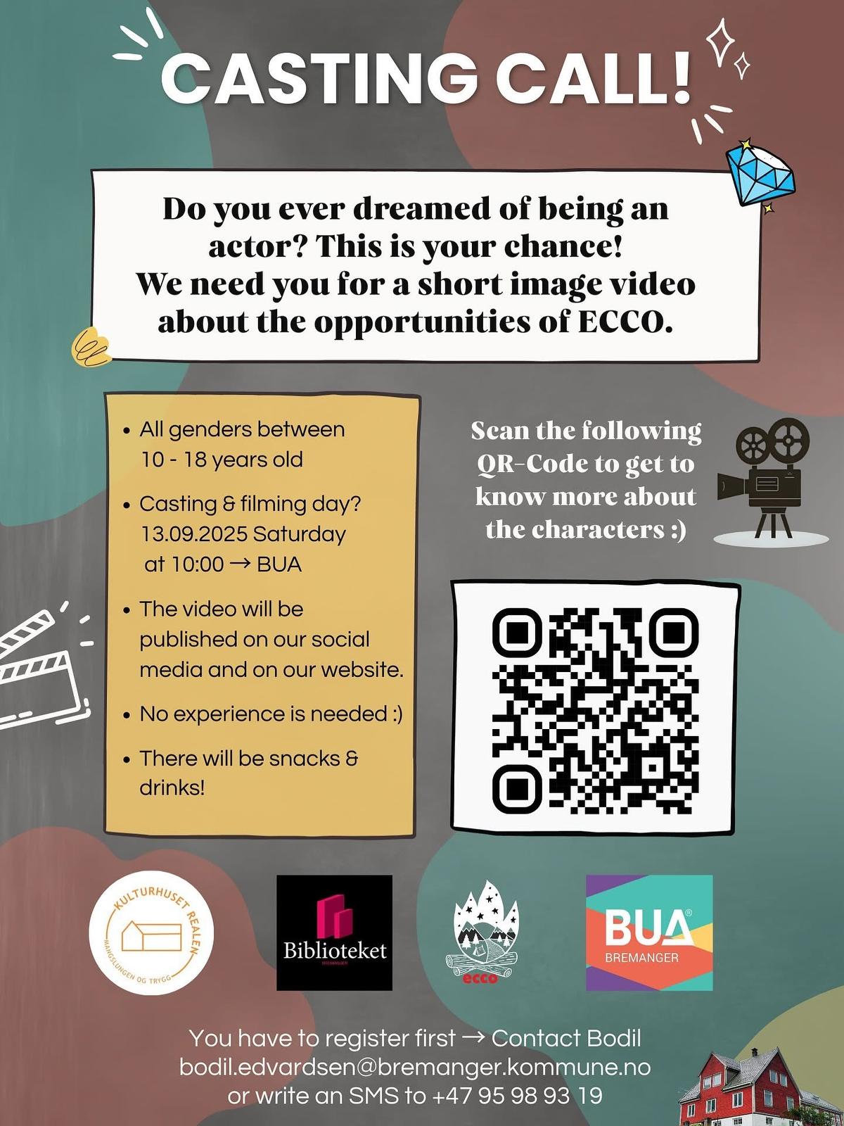 No har du sjansen å bli skodespelar! Kom til BUA Bremanger og bli med på laurdag. Du treng ingen skodespelarerfaring, berre energi og entusiasme. Det blir snacks & drikke til deg!