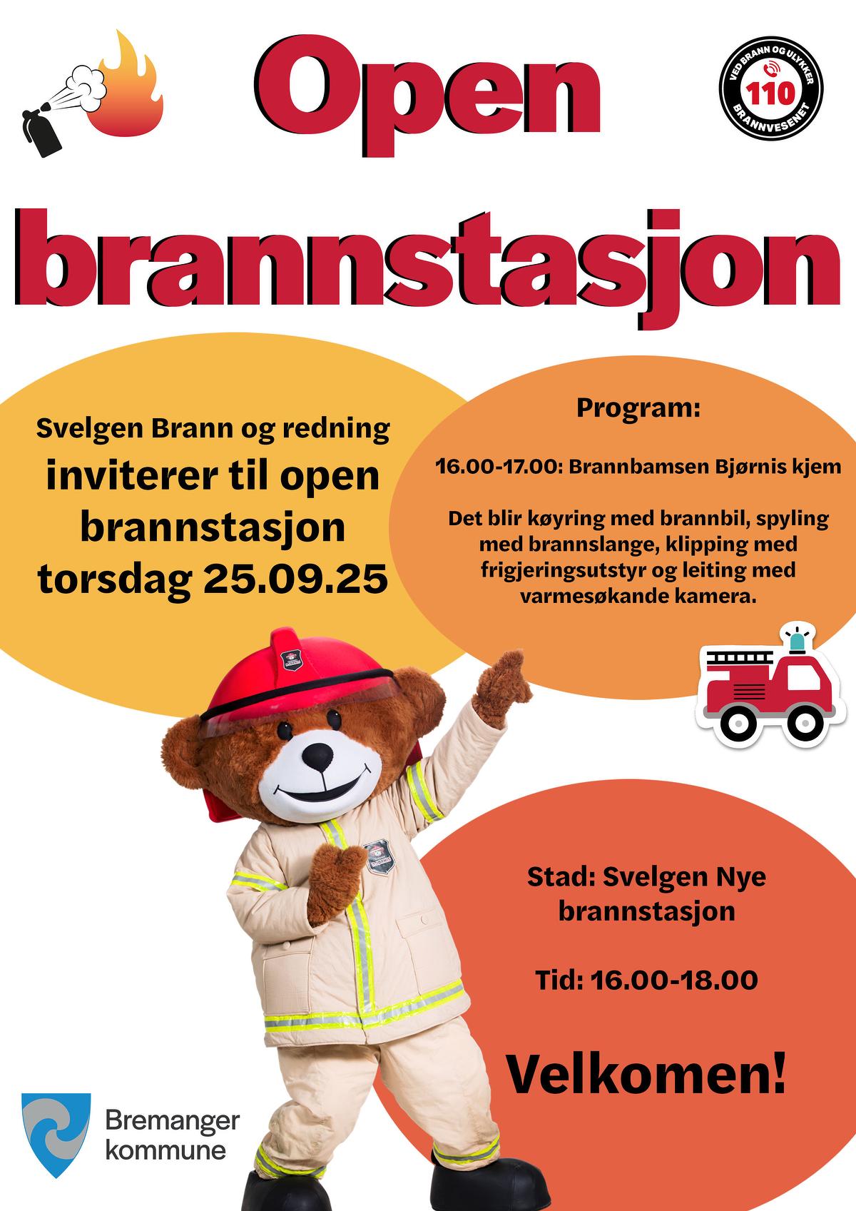 Svelgen Brann og redning inviterer til open brannstasjon torsdag 25.09.25 Program: 16:00-17:00: Brannbamsen Bjørnis kjem. Det blir køyring med brannbil, spyling med brannslange, klipping med frigjeringsutstyr og leiting med varmesøkande kamera.