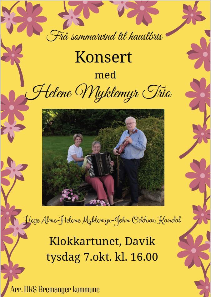 Helene Myklemyr spelar trekkspel og gitar, John Oddvar Kandal spelar fele og Hege Alme er vokalist. I regi av den kulturelle spaserstokken kjem trioen i år med programmet «Frå sommarvind til haustbris» Sjølv om sommaren for lengst er omme, vil me gjerne halde på den så lenge som mogeleg, og serverer difor lett og fengande underhaldning som tek oss attende til lyse sommardagar, samstundes som me tek i mot hausten og sjarmen den har å by på. Kanskje vert også dansefoten medriven med nokre lette dansesteg for den som ynskjer det?