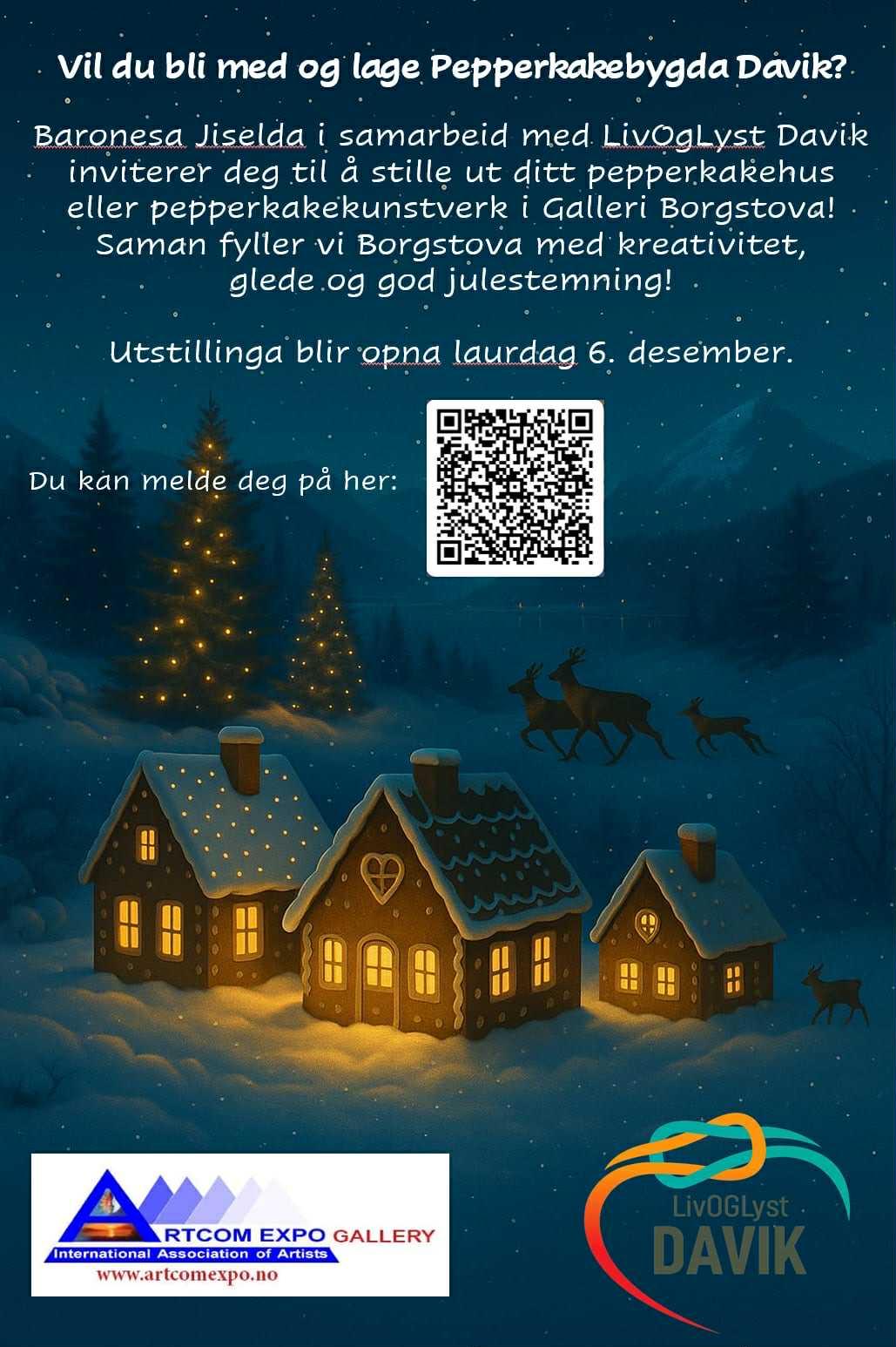 Vil du bli med og lage Pepperkakebygda Davik 2025? Baronesa Jiselda i samarbeid med LivOgLyst Davik. Inviterer deg ti å stille ut ditt pepperkakehus eller pepperkakekunstverk i Galleri Borgstova !Vil du bli med og lage Pepperkakebygda Davik 2025?